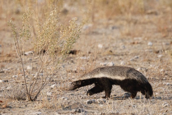 Another 6.30am breakfast and 7am departure. We followed a hornbill for a while and a honey badger. The latter was quite striking, grey fur above eyes to tail and black below. He was a determined creature, scuttling across the landscape in search of breakfast.