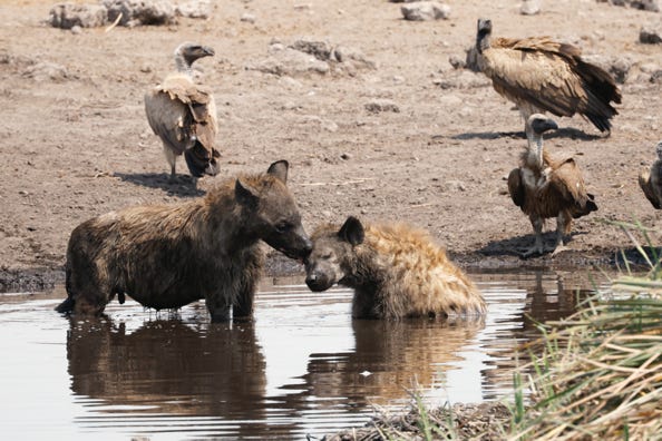 Mid morning we spent some time at a water hole. Although we couldn’t see it, due to reeds being in the way, a recent kill drew in hyenas, vultures, and jackals. Every so often the wind changed direction and we grimaced at the foul smell of rotting meat. The hyenas left the kill to drink water and to cool off in the water hole. When two of them were together, one licked the face of the other. One jackal ran from the carcass, yelping, probably due to a bite from a vulture. A different jackal was made of sterner stuff, and actually chased birds away.