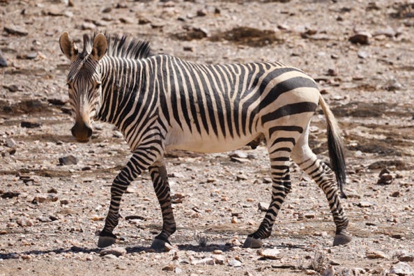 Our first significant sighting was of a black rhino, with horns, grazing in the bush. We never got a good shot of him due to the shrubbery. Later on we encountered a herd of zebra, with one wildebeest following behind. ‘Self-identifying as a zebra,’ we decided. Then a pair of spotted hyena, male and female. We stopped at a waterhole to admire more zebra and various antelopes.