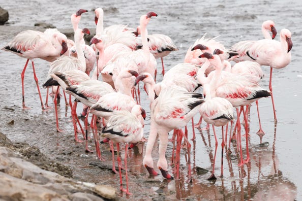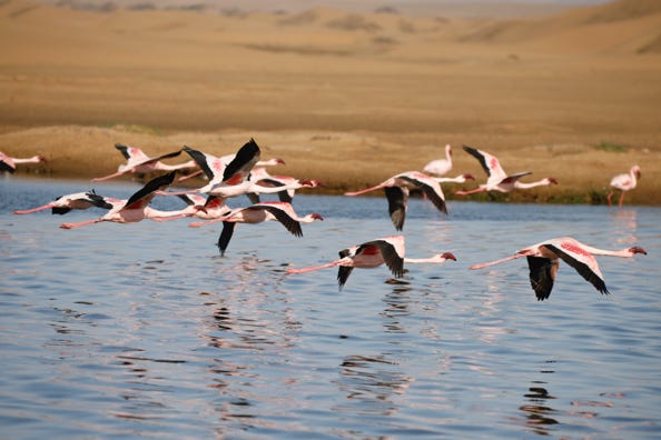 Later afternoon we arrived in Walvis Bay. Our last photographic stop was at lagoons filled with flamingoes and a few other aquatic birds. We had a happy time shooting pink birds against yellow sand dunes, although the smell of refuse being burnt at the nearby tip added an unfortunate acrid note. As were the people who got out of their cars to view the flamingoes, rather than remain inside as we had done. Their approach often scared the birds, which did give us plenty of opportunities to take photos of the birds in flight.