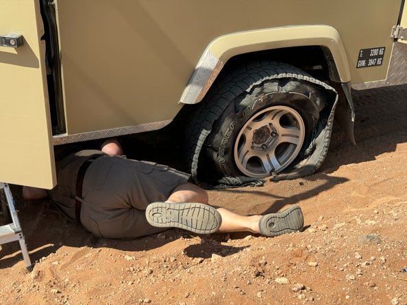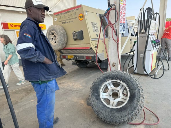The day was devoted to driving. We bumped our way down the track, and later in the morning we had a flat tyre. Our guide put on a replacement. We stopped at a petrol station, where the tyre was repaired and we bought drinks and snacks from a small convenience store.