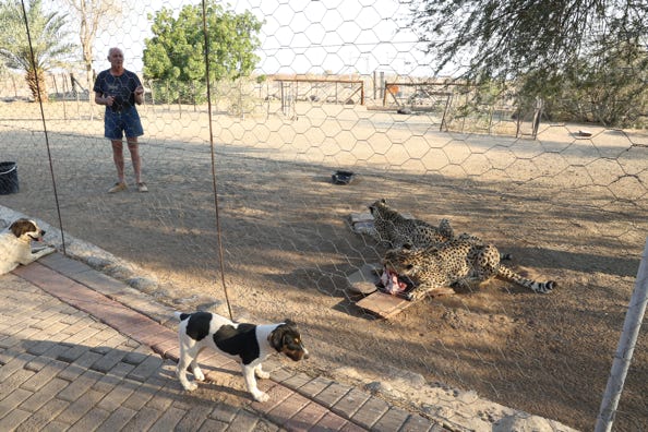 At 5pm we went to watch the two resident cheetahs being fed. They had been orphaned, and the owner of the lodge complex took them in. As they had been reared by humans, they cannot be returned to the wild. The owner holds the necessary permits. Legally he’s not allowed to charge money for people to view them. The enclosure was very large and the two animals looked healthy although, the owner told us, they are overweight as they simply don’t get the exercise they would in the wild. He stood in the enclosure by the two cats, explaining that you’re safe as long as they can see you. Never walk behind a cheetah.