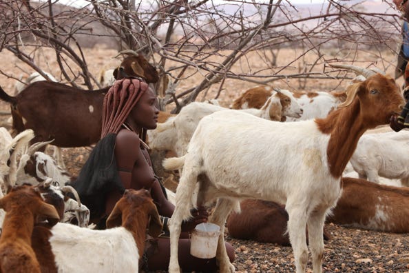 Breakfast was porridge and bread. Around 7.30am we headed out to a local Himba encampment, arriving in time to watch the woman and children herding the goats. Our interpreter obtained permission for us to visit and to take photos. Several goats were held by the horns whilst being milked, although not much was taken. Shortly thereafter the herd was split, the older goats to be taken further away in order to graze.