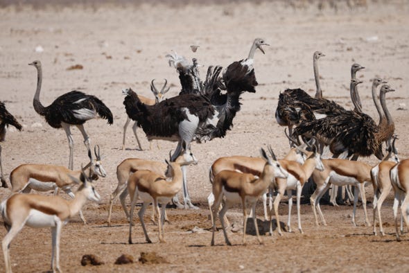 We drove on to a rather busy waterhole. Herds of ostriches, springbok, oyrx, and zebra congregated at the water’s edge. Several kudu joined them, seemingly far more cautious. Birds swung past and overhead, eating the insects stirred up by the heavier animals.