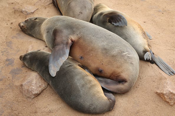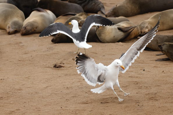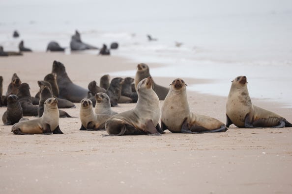 We spotted more jackals as we headed back towards the sea and then on to the peninsula at Sandwich Harbour. Driving past large groups of shorebirds and pelicans, we stopped at one of the many seal colonies. The adult seals argued amongst themselves whilst the youngsters huddled together in groups. At times a number of seals would plunge towards the surf, the elders driving in whereas the pups entered the water more carefully.