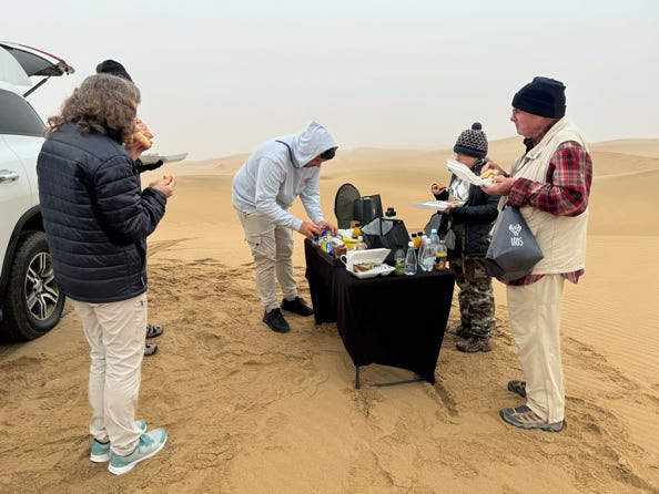 At 4.30pm, as agreed, the rest of the group had returned to the vehicle. We drove back through the strong winds. Sand swirled around small sand dunes, something I’ve never witnessed before. As we left the coast, the winds eased. We stopped to admire a herd of oryx before arriving back at our lodge around 5.30pm.