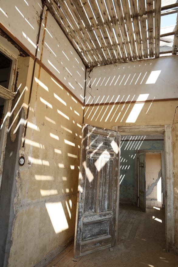 We returned to Kolmanskop. There is a shot which most people take, of a series of open doorways leaded to an angled door. I hadn’t found the place in the morning, and our guide ducked in and out of buildings trying to remember where it was. When he decided it was near at the end of the road through the town, I decided it wasn’t essential to photograph it myself. Instead I walked up to the engineer’s house, known as ‘the slatted building’. As the roof has gone, in the afternoon sunlight forms stripes on the walls and sand as it streams through the wooden beams.