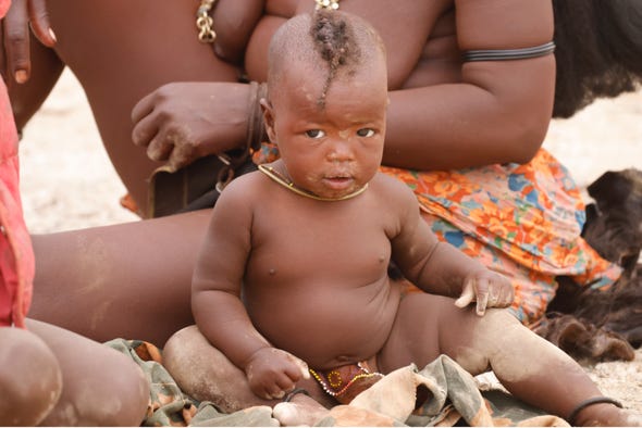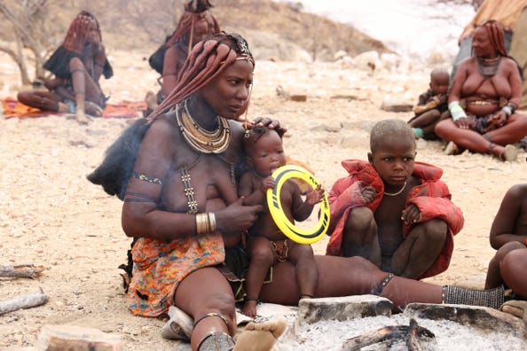 Himba women traditionally smear orchre dirt mixed with animal fat over their skin. Their hair is braided and indicates their marital status. Young women have braids which extend stiffly over their foreheads. Woman who are mature enough to be married, as determined by their father, start braiding the hair from the back. When a man decides he wants a particular young woman as his wife, he approaches her father to discuss this.