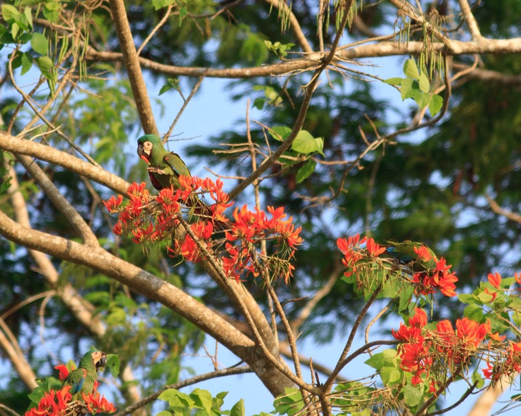 These parrots took much longer to gather. By 8am I was beginning to wonder if they would be no shows. Then the macaws appeared, flying into trees and carrying on long conversations. Blue and gold, scarlet, and green and red, along with some dusky headed parrots. Conures flew overhead but didn’t seem to want to land. We had to contend with bees, which seemed to be very interested in our bags.