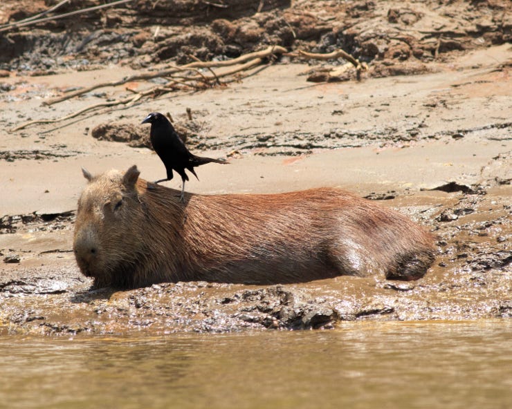 More bird life. Macaws (hurrah! The others are getting used to my infatuation) and kingfishers. We also had some very excellent spottings of Capybara. One set were wallowing in the mud and a Cowbird hopped from one to the other to pick off insects. We also saw a deer, which is supposedly a rare thing to see.
