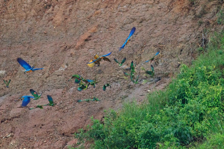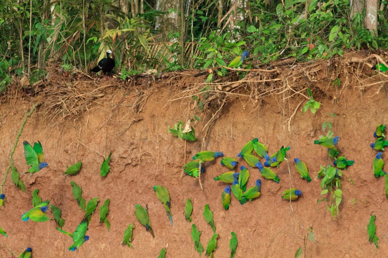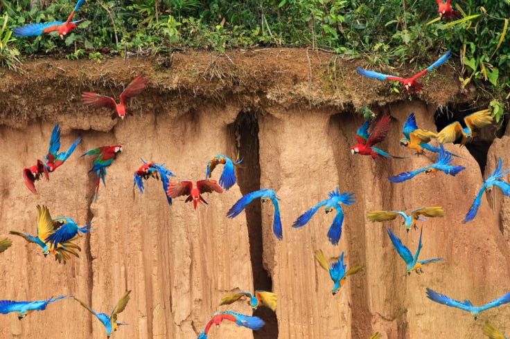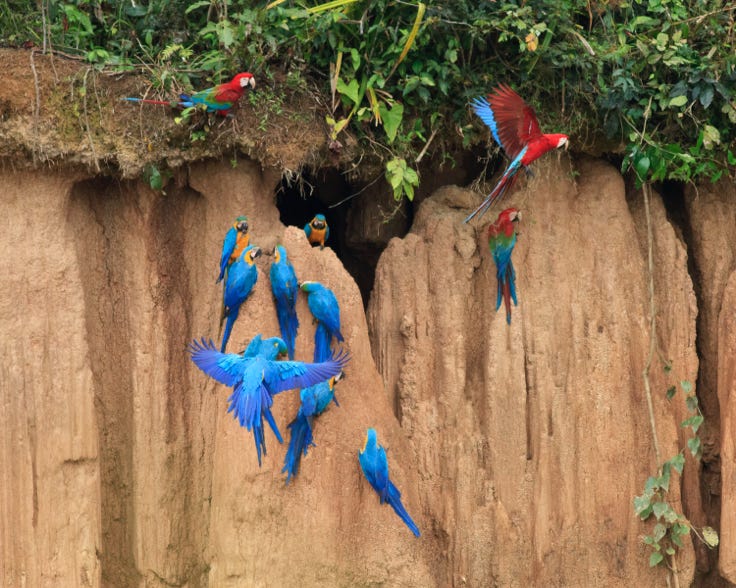Then the macaws made their move. A few, then a few more, then a rainbow cascade clinging to the cliffs to eat clay. Others were in the bushes above, eyeing the plunge. My camera started making its own distinctive noise. Then I started to cry. Oh, well, I’ve only wanted to see this for around 30 years. I wiped my eyes, blew my nose, and got back to photography.