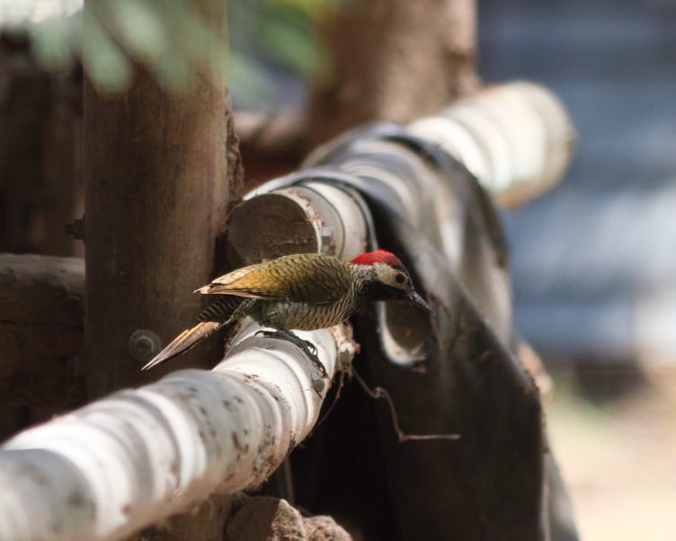 We went on and, with their permission, went birding through the grounds of a rather lovely hotel. We saw flycatchers, more hummingbirds, and the hotels pet macaw. The macaw's handlers were trying to convince him to fly down from a tree, and he was giving them the same look my parrot gives me when she too has flown somewhere high and doesn't want to come down. There were llamas and chickens wandering around the area. Then we heard flock of a Scarlet fronted conures. Now I was even more excited. They hid quite well in the trees, and I got a just about acceptable one. We also saw another of this rare woodpecker, trying to get water out of a pipe.
