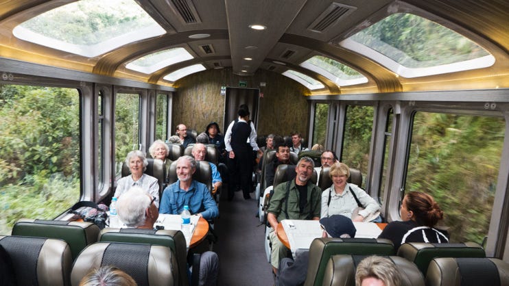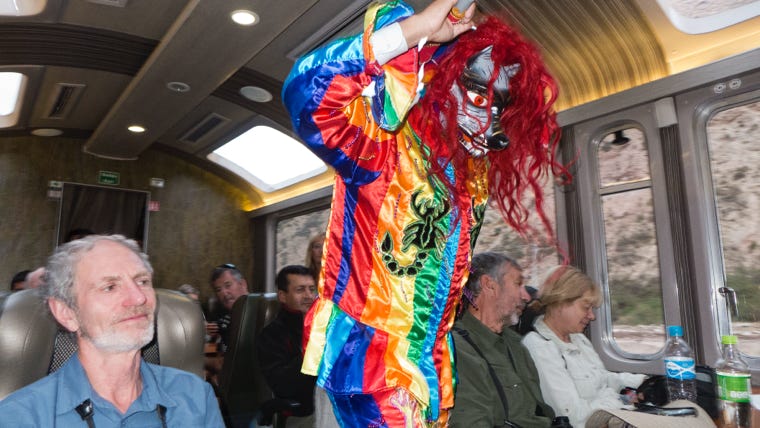 After a very nice lunch we caught our train back to the outskirts of Cusco. We had the carriages with the observation windows, and were served drinks and snacks at our seats. There were some stunning views of the mountains and glaciers. Later on in the journey we were entertained by a man wearing the traditional costume of a local annual celebration. This was followed by a fashion show, demonstrating various items made of alpaca which could be purchased.