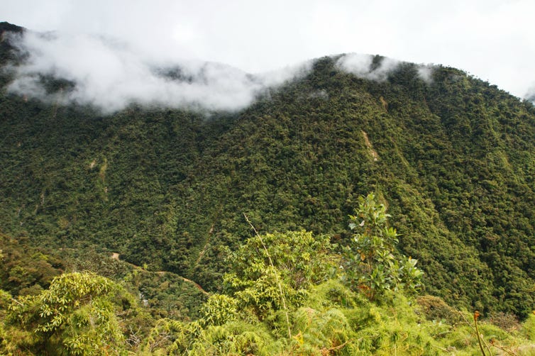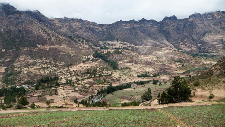 We started in the very dry conditions of the mountains around Cusco. As we climbed in elevation we passed many small villages. Many of the inhabitants wore what I would think of as traditional Peruvian outfits. Dogs would run out from the small farms to chase our bus (we managed not to hit any). Pigs, cows, and donkeys were grazing near each other. Sometimes they would be together on the road, being herded by their owners.