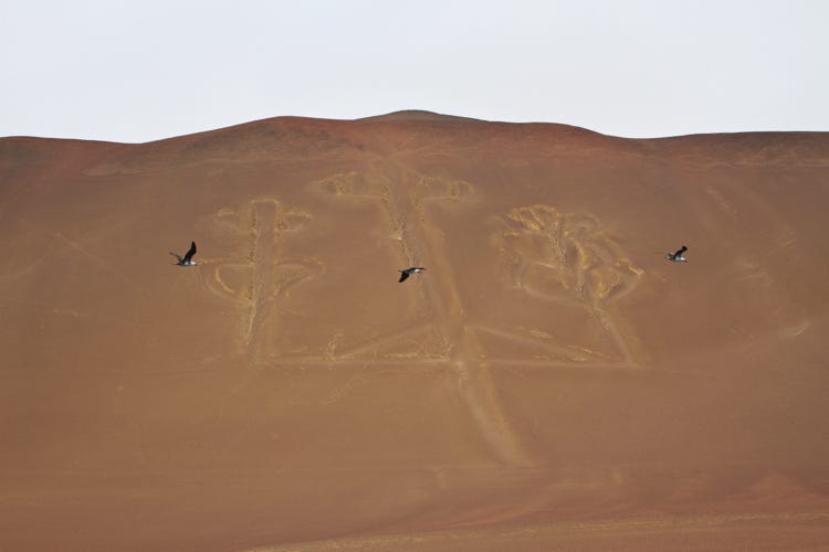 We dropped back to our hotel, had half an hour's breather, and then headed out to the Paracas Nature Reserve. The desert runs down to the ocean. We stood at the shoreline admiring the birds and trying to breathe in the stiff wind. The van grumbled over the trace of road to take us to another viewpoint. Then back over the sandy, dusty landscape for dinner.