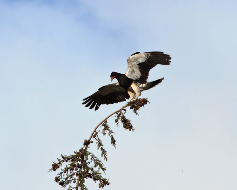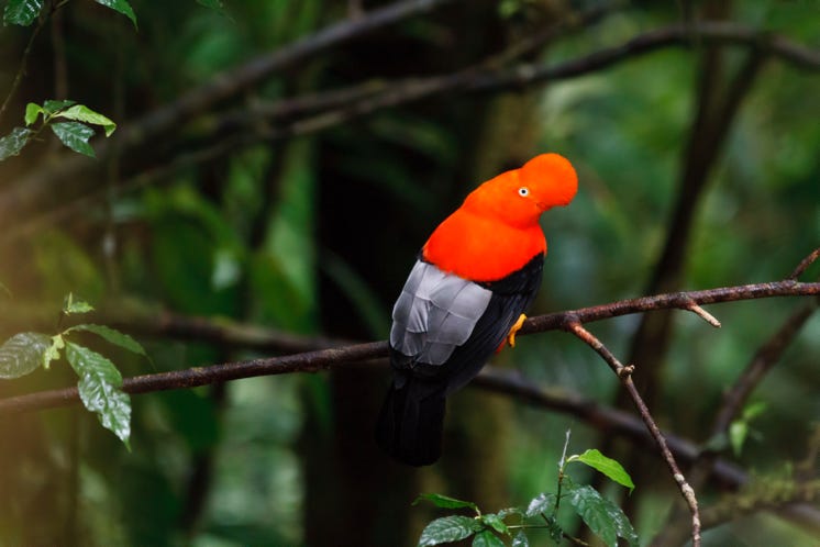 More lovely birds around the lodge. Then we drove up to the blind for the Cock of the Lodge lec. The males of these bright red birds show off—lec—twice a day, early morning and mid afternoon. We had good clear sightings of the birds, but sadly the light was very dim as the clouds had come in. The performance was worth seeing, as the birds bobbed up and down and occasionally drove one another away. Six males were in attendance, but we didn’t see any females.