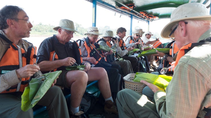 A bus took us to the embarkation point for the covered motorized canoes. Our lunch was on board—a variation on Chinese fried rice, wrapped up in a banana leaf.