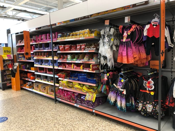 Near the entrance was a moving walkway which whisked people upstairs to the clothing section, café, electronics, and kitchenware. On the ground floor the central walkway offered food on the right and household items on the left. Halloween costumes and decorations were what a shopper first encountered, with multi-packs of lager beers nearby. (Maybe the beers are for adult trick or treating? I could enjoy that.)