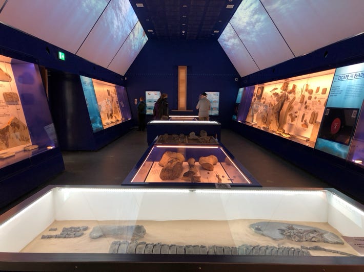 The main display area showed off the best fossils and had well written explanations. Everything was grammatically correct, which was a nice surprise. (I’ve visited countless attractions which use apostrophes for the plural and, memorably, Warwick Castle which stated that knights ‘preyed’ the night before a battle.) A collection of coprolites amused me (did you know that dinosaur poo can be fossilised?) as well as skeletons which showed prey inside the rib cages.