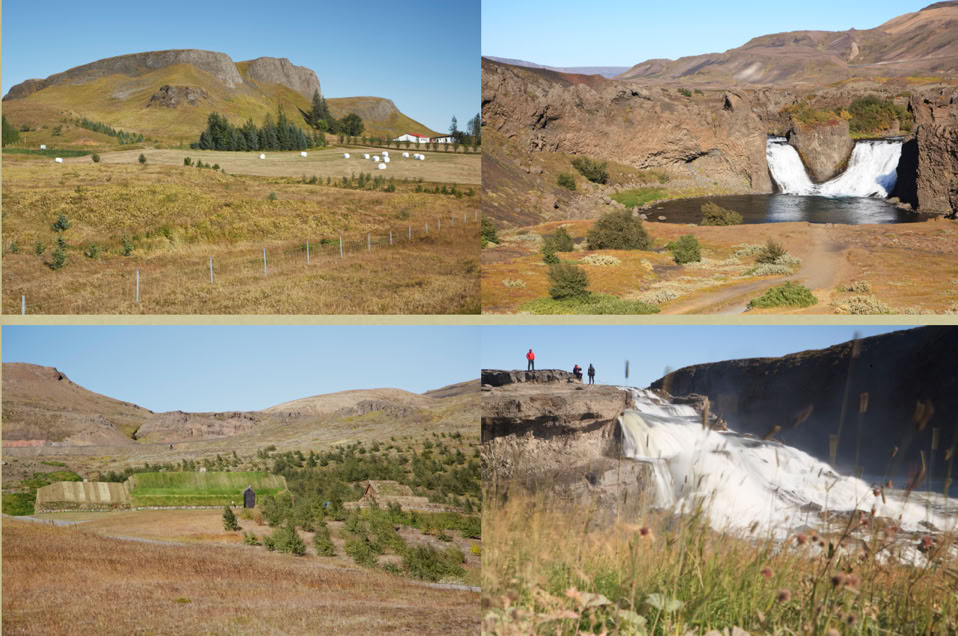 We drove to the Pjorsardalur valley. The whole area is is full of farms, a pleasing rather than a dramatic landscape. The longhouse replica of dwellings from the 1100s was shut, but we admired it from the outside. The nearby waterfall, Hjalparfoss, was beautiful and we were lucky to enjoy it in solitude. As we were leaving a coach load of tourists arrived, utterly changing the character of the place.