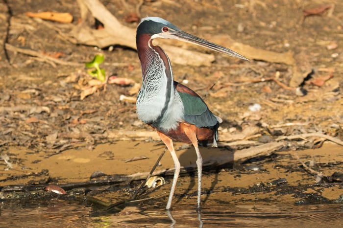 We managed to spot a toucan, and I took photos even though I no longer like them. We saw a Great egret doing his best to swallow a large fish, and viewed an interesting butterfly. We had our best encounter with an Agami heron, birds which are difficult to spot because they usually stay in the undergrowth. I admired a Green kingfisher who had a massive scar by her left foot. She was actively hunting, and I wondered what had caused the original wound and was amazed that she’d survived.