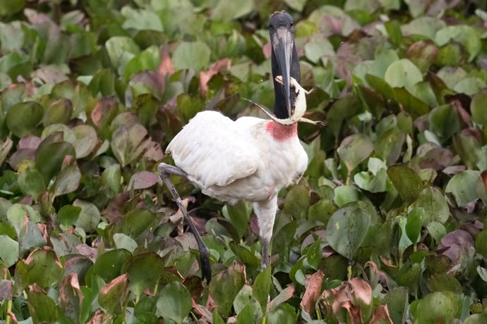 We drove slowly along the road, admiring the Capped herons with their long head feathers. A Jabiru stork had captured a young caiman, and we watched him swallow it. I did wonder if the reptile would try to bite back once inside the bird’s stomach?