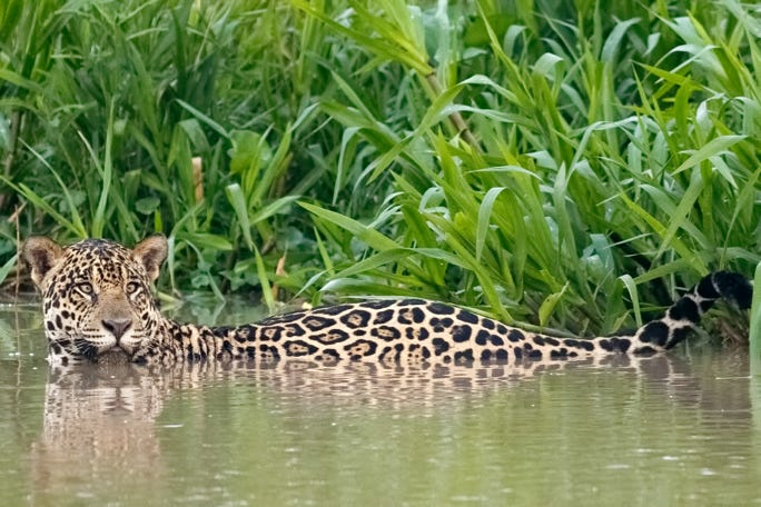 The afternoon proved to be the most successful for jaguar spotting. Our guide spotted one in the distance catching a capybara, but the cat had dragged the kill into the bushes by the time we arrived. We saw one female resting in the bushes. A bit further down, a male was waiting patiently near a female. She finally moved, gave him a ‘come hither’ look, and they disappeared into the bushes. Loud snarls and shaking branches indicated that mating took place.